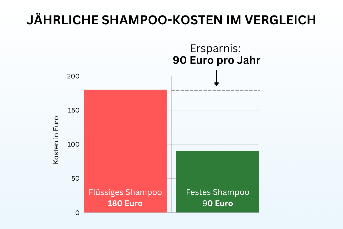 Festes Shampoo: 14,99 Euro × 6 Stück pro Jahr = 90 Euro