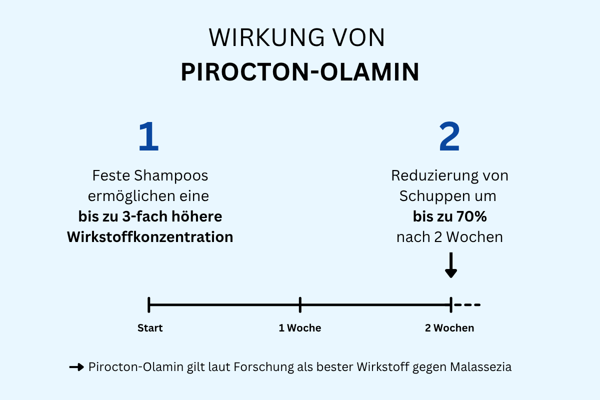 Feste Shampoos mit Pirocton-Olamin gehen beide Probleme gleichzeitig an. Pirocton-Olamin gilt laut Forschung als der beste verfügbare Wirkstoff gegen Malassezia und kann Schuppen um bis zu 70% in nur 2 Wochen verringern. [2] [3]